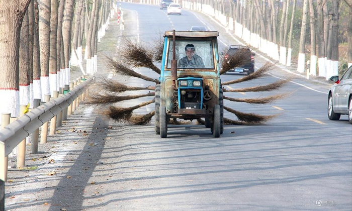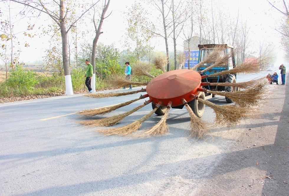 โดยรถกวาดถนนคันนี้ทั้งแปลกประหลาดและน่าสนใจมาก เมื่อมันมีไม้กวาดไม้ไผ่ถึง 16 ด้าม ติดตั้งในกงล้อเหล็กกลมบนเพลารถ จากนั้นนำไปต่อพ่วงท้ายกับรถแทรกเตอร์ขนาดเล็ก แล้วหมุนกวาดทำความสะอาดไปตามพื้นผิวถนน