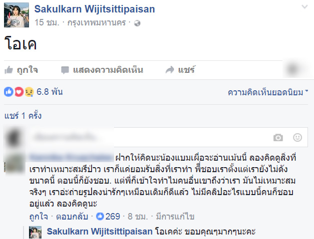 อย่างไรก็ตาม เมื่อมีแฟนคลับเข้าไปแสดงความคิดเห็นในเชิงติติง เด็กสาวซึ่งเป็นเจ้าของเฟซบุ๊กและเป็นหนึ่งในกลุ่มเด็กสาวที่เต้นสายย่อดังกล่าว ก็เข้ามาแสดงความคิดเห็นตอบกลับ โดยน้อมรับคำแนะนำ