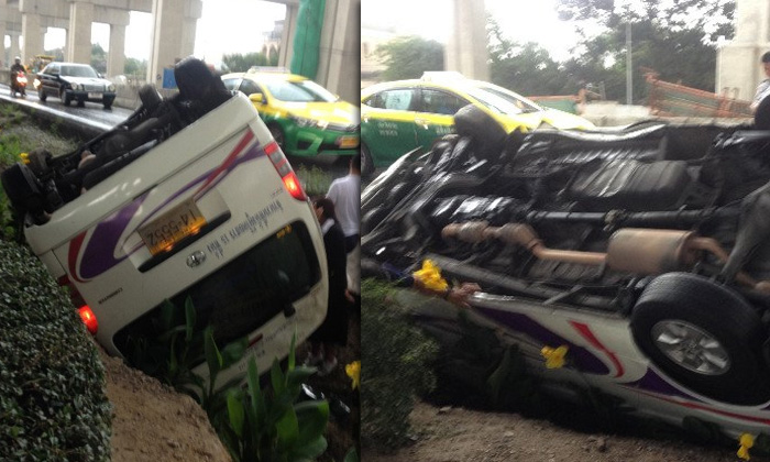 รถตู้โดยสารเสียหลักลื่นฝน พลิกคว่ำใกล้สนามบินดอนเมือง