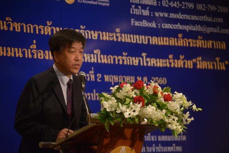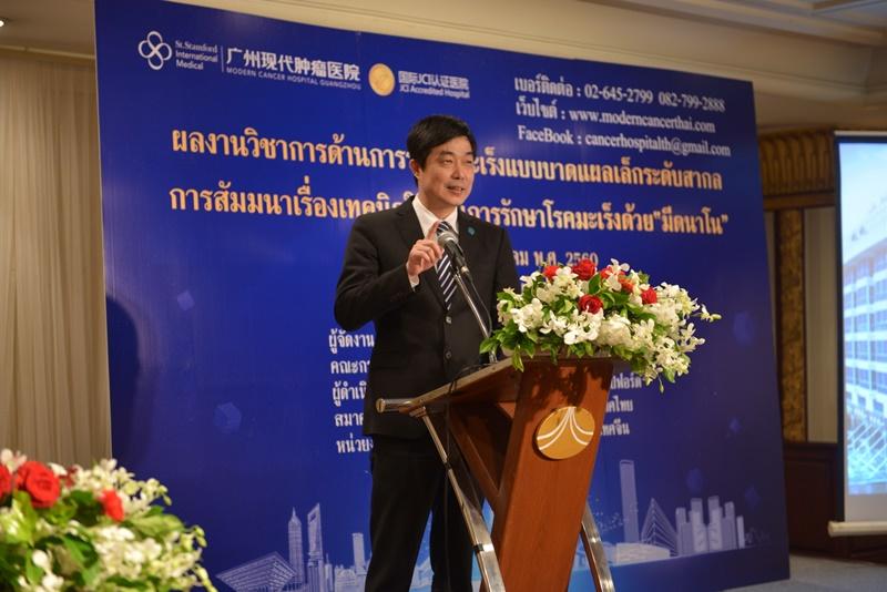 นายหลิน ช่าว หัว รองผู้อำนวยการ กลุ่มบริษัท ป๋ออ้าย กรุ๊ป จำกัด “โรงพยาบาลมะเร็งสมัยใหม่กว่างโจว เป็นโรงพยาบาลในเครือบริษัท ป๋ออ้าย เมดิคอล เซอร์วิส กรุ๊ป ก่อตั้งมานานกว่า 11ปี โดยมีเป้าหมายด้านการรักษามะเร็งเป็นหลัก ได้ผ่านการรับรองคุณภาพสถานพยาบาล JCI (The Joint Commission International)สำหรับการรักษามะเร็ง ทางโรงพยาบาลมีความโดดเด่นในด้านการรักษาแบบเฉพาะจุด บาดแผลเล็ก ผสมผสานระหว่างแพทย์แผนจีนและตะวันตก โดยมีเทคโนโลยีการรักษามะเร็งที่ทันสมัยถึง 18 อย่าง ได้แก่ การใช้คีโมเฉพาะจุด การรักษาโดยใช้ความเย็น และการปลูกถ่ายเซลล์ภูมิคุ้มกัน เป็นต้น โดยรักษาผู้ป่วยมะเร็งมาแล้วหลายหมื่นคน ซึ่งทุกปีจะมีคนไข้จากประเทศไทย เวียดนาม ฟิลิปปินส์ บังคลาเทศ กัมพูชา มาเลเซีย ซาอุดิอาระเบีย ญี่ปุ่น และไต้หวัน เข้ารับการรักษา และล่าสุดโรงพยาบาลมะเร็งสมัยใหม่กว่างโจวแสตมฟอร์ด ยังได้พัฒนาวิธีการรักษาโดยการใช้มีดนาโน เพื่อส่งเสริมความรู้ทางการแพทย์ และพัฒนาการบริการอย่างไม่หยุดยั้งช่วยพัฒนาคุณภาพชีวิตของผู้ป่วยอีกด้วย”
