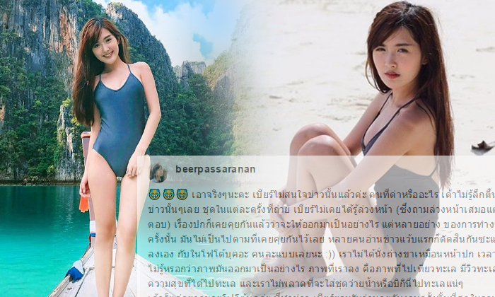"เอาจริงๆ นะคะ เบียร์ไม่สนใจข่าวนั้นแล้วค่ะ คนที่ด่าหรืออะไร เขาไม่รู้ลึกตื้นหนาบางของข่าวนั้นๆ เลย ชุดในแต่ละครั้งที่ถ่าย เบียร์ไม่เคยได้รู้ล่วงหน้า (ซึ่งถามล่วงหน้าเสมอแต่ไม่เคยได้คำตอบ) เรื่องปกก็เคยคุยกันแล้วว่าจะให้ออกมาเป็นอย่างไร แต่หลายอย่างของการทำงานโฟโต้บุ๊กครั้งนั้น มันไม่เป็นไปตามที่เคยคุยกันไว้เลย หลายคนอ่านข่าวแวบแรกก็ตัดสินกันซะแล้ว ภาพที่เราลงเอง กับในโฟโต้บุ๊กอะ คนละแบบเลยนะ :)) เราไม่ได้นั่งถ่างขาเหมือนหน้าปก เวลาโดนถ่าย เราไม่รู้หรอกว่าภาพมันออกมาเป็นอย่างไร ภาพที่เราลง คือภาพที่ไปเที่ยวทะเล มีวิวทะเลที่สวย เรามีความสุขที่ได้ไปทะเล และเราไม่พลาดที่จะใส่ชุดว่ายน้ำหรือบิกินีไปทะเลแน่ๆ"