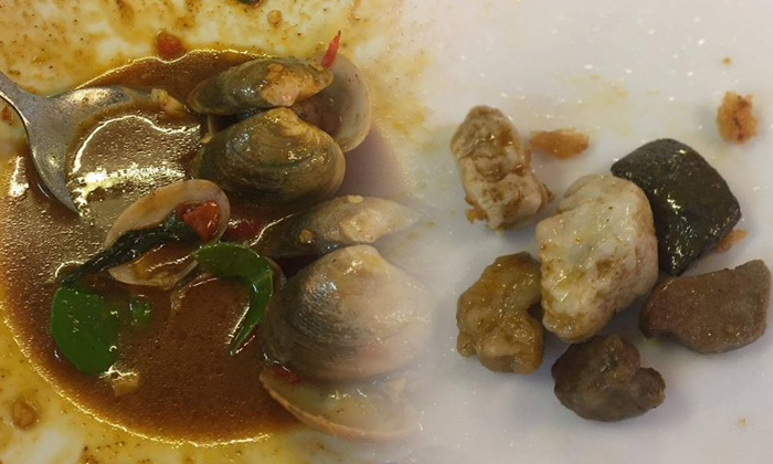 ในตอนแรกคิดว่าหอยหลุดออกมาตอนปรุง แต่ปรากฏว่าตักใส่ปากเคี้ยวฟันแทบหักคายออกมาเป็นหินรวมทั้ง 2 จานได้ 15-16 ก้อน ขนาดเท่าตัวหอยเลย จึงเชื่อว่าคนขายแอบใส่หินปนลงไปในหอยหวาน เพื่อเพิ่มน้ำหนักตอนชั่งกิโลกรัมขาย