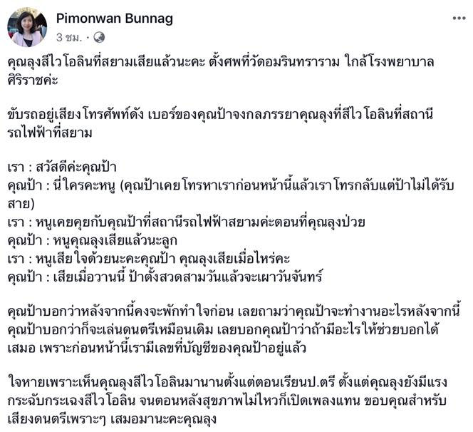 ล่าสุด (21 ก.ค.) เฟซบุ๊ก Pimonwan Bunnag เปิดเผยว่า ได้รับโทรศัพท์จากคุณป้าจงกล ทังสุนันท์ ภรรยาคู่ชีวิตของคุณลุงสีไวโอลิน ทราบว่าคุณลุงเสียชีวิตแล้ว เมื่อวานนี้ (20 ก.ค.) โดยคุณป้าจงกล จะตั้งสวด 3 วัน ที่วัดอมรินทราราม ใกล้โรงพยาบาลศิริราช และทำพิธีฌาปนกิจในวันจันทร์นี้