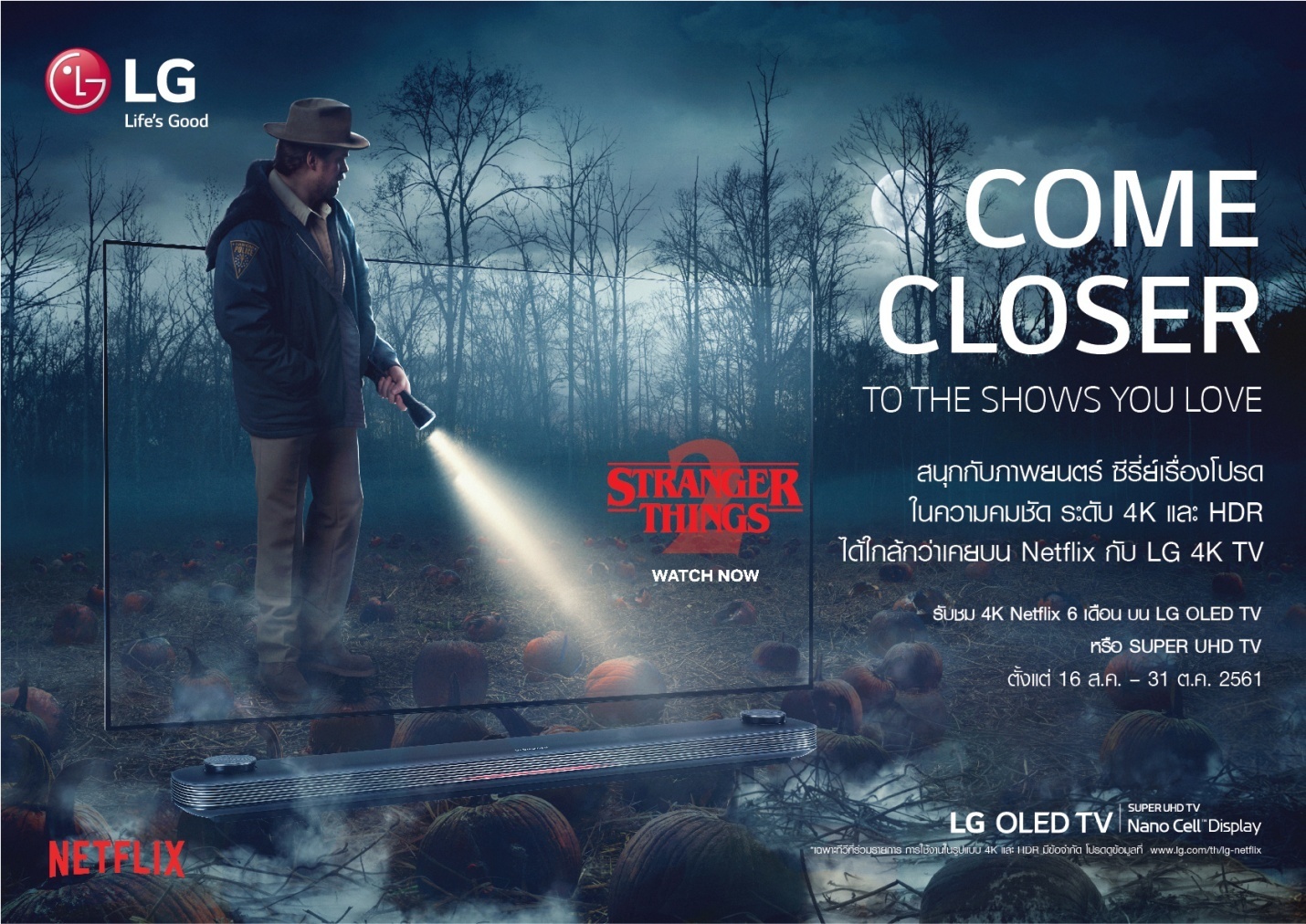 สัมผัสมิติแห่งความคมชัดสมจริงจากภาพยนตร์และซีรีส์ครบทุกอรรถรสในแคมเปญ “Come Closer To The Shows You Love” บน Netflix กับ LG OLED TV และ LG SUPER UHD TV ตั้งแต่วันนี้ถึง 31 ตุลาคม 2561 ณ ร้านค้าตัวแทนจำหน่ายที่โฮมโปร เพาเวอร์บาย เพาเวอร์มอลล์และร้านค้าดีลเลอร์ที่ร่วมรายการ ผู้ที่สนใจสอบถามรายละเอียดเพิ่มเติมได้ที่ศูนย์ข้อมูลแอลจี 0-2878-5757 หรือ www.lg.com/th/lg-netflix