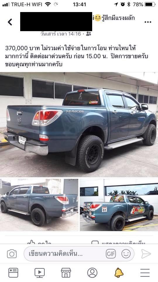 "มีรถคันนึงบอกขายอยู่ในราคา 380,000 บาท วันเสาร์ที่ 22/9/61 ที่ผ่านมาเวลาประมาณ 10.30 ผมได้เข้าไปดูรถที่ซอยลาดพร้าว 101 แยก 42 และเจ้าของรถบอกว่าค้างไฟแนนซ์อยู่อีก 8 หมื่นกว่าบาทและโชว์ใบเสร็จให้ผมดูว่ายอดคงค้างว่าเหลือเท่าไหร่ ผมต่อรองราคาไว้ที่ 340,000 บาท แต่เจ้าของรถยังไม่พอใจกับราคาที่ผมเสนอไปให้ ผมเลยกลับบ้านโดยยังไม่ได้มีการซื้อขายกัน ต่อมาในวันเดียวกันเวลาประมาณ 17.30 น. เจ้าของรถโทรกลับมาหาผมและบอกว่าจะตกลงขายในราคาที่ผมเสนอไว้คือ 340,000 บาทแต่จะขอเงินสดก่อน 200,000 โดยให้โอนให้เขา" ผู้โพสต์ระบุ