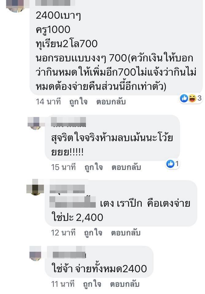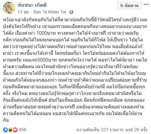 เราถามว่าคุณรับกติกาก่อนกินได้ไหมทุกคนบอกได้ พอกินไม่ได้ก็โพสต์ให้เป็นข่าว ซึ่งพ่อค้าบอกก่อนใช่ไหม ว่าพอเสียตังค์แล้วก็ดราม่า เราคงชี้แจงได้เท่านี้ ใครพร้อมก็มา ใครไม่พร้อม ผมคงไม่ต้องการให้มานะครับ ผมแจก 5,000 บาท ทุกคนก็หวังว่าจะได้ พอทำไม่ได้ก็ดราม่า ผมไม่ห้ามความคิดคน เพจไหนสำนักข่าวไหนอยากรู้ความจริงมาที่ร้านผมพร้อมชี้แจง