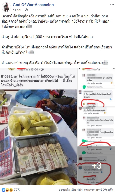แล้วค่าพวกนี้มายังไง ทำไมคุณไม่บอกไปตั้งแต่ทีแรก ว่ามีค่าครู ค่าปอกทุเรียน 1,000 บาท มาจากไหน ทำไมคุณไม่บอก ค่าปรับมายังไง ไหนคุณบอกว่าคิดเงินเท่าที่กินไง แล้วค่าปรับที่ยกทุเรียนมา คุณคิดเงินเค้าทำไม ถ้าเจตนาค้าขายสุจริตจริง ทำไมไม่บอกข้อมูลทั้งหมดตั้งแต่แรก"