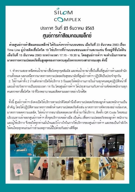 ศูนย์การค้าสีลมคอมเพล็กซ์ ได้รับแจ้งเมื่อวันที่ 23 ธ.ค.63 เรื่องไทม์ไลน์ผู้ป่วยติดเชื้อโควิด-19 เข้ามาใช้บริการที่ร้านบอนชอน และร้านสเวนเซ่น ซึ่งอยู่ที่ชั้นใต้ดิน เมื่อวันที่ 15 ธ.ค.63 ระหว่างเวลา 17.15-19.30 น. โดยศูนย์การค้าฯ จะดำเนินการตามมาตรการความปลอดภัยขั้นสูงสุดของกรมควบคุมโรค กระทรวงสาธารณสุข