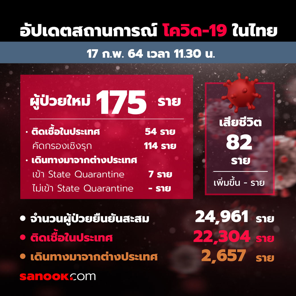 ล่าสุด สถานการณ์การแพร่ระบาดของโรคติดเชื้อไวรัสโคโรนา 2019 (COVID-19) หรือ โควิด-19 ในไทยวันนี้ พบผู้ติดเชื้อรายใหม่เพิ่ม 175 ราย ผู้ป่วยยืนยันสะสม 24,961 ราย หายป่วยแล้ว 23,697 ราย ยังรักษาใน รพ. 1,182 ราย ไม่มีผู้เสียชีวิตเพิ่ม รวมยอดเสียชีวิตสะสม 82 ราย