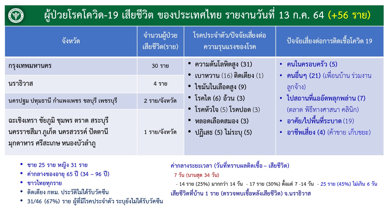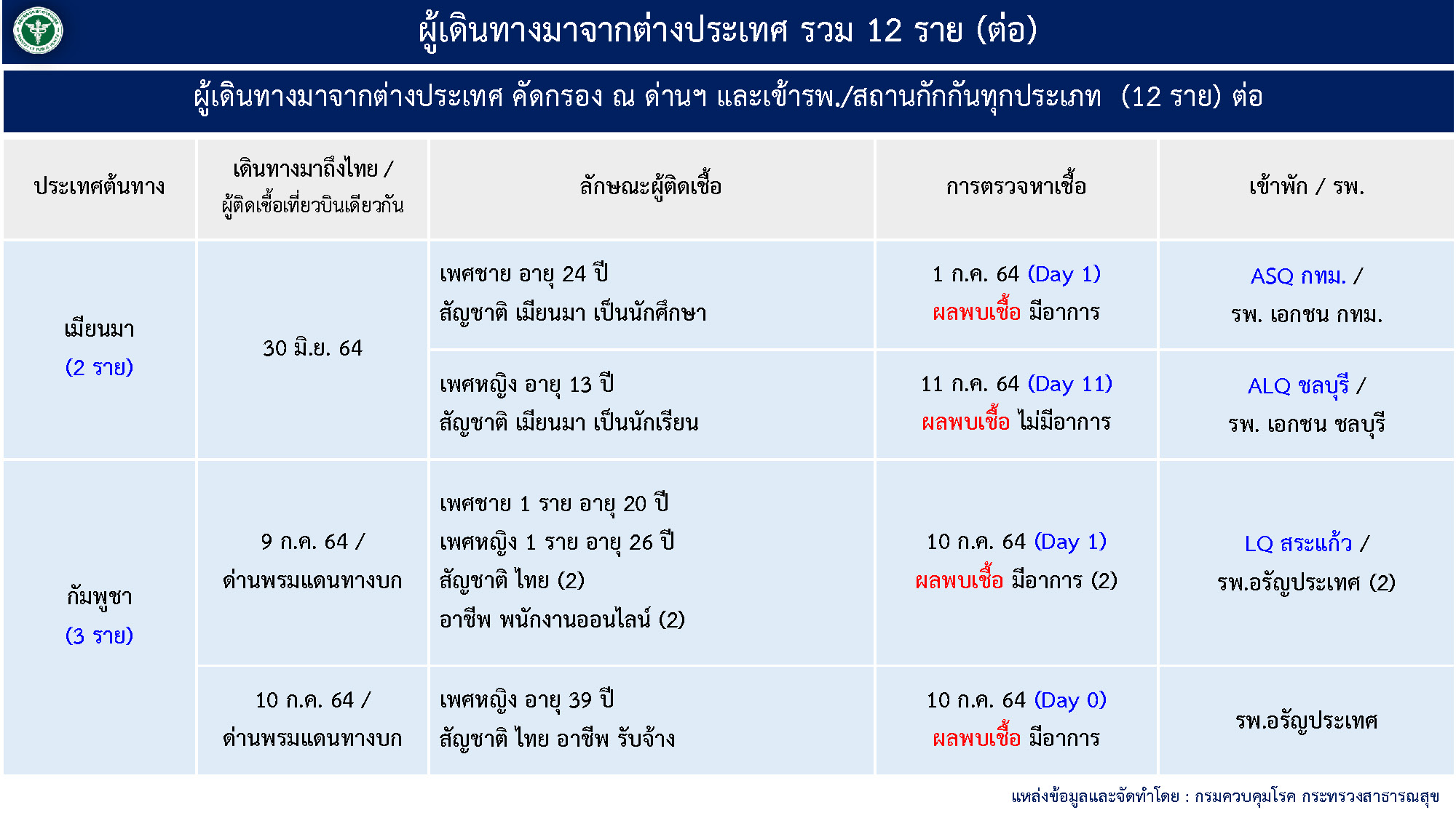 หมายเหตุ : อัปเดตข้อมูล เวลา 12.30 น. จากการแถลงของศูนย์บริหารสถานการณ์การแพร่ระบาดของโรคติดเชื้อไวรัสโคโรนา 2019 (ศบค.)