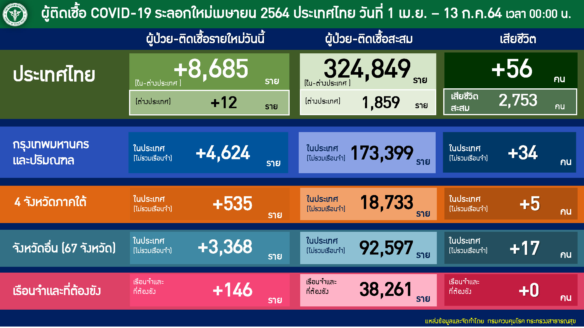 ล่าสุด สถานการณ์การแพร่ระบาดของโรคติดเชื้อไวรัสโคโรนา 2019 (COVID-19) หรือ โควิด-19 ในไทยวันนี้ พบผู้ติดเชื้อรายใหม่เพิ่ม 8,685 ราย แบ่งเป็นผู้ติดเชื้อใหม่ 8,539 ราย และผู้ติดเชื้อในเรือนจำ 146 ราย ยอดติดเชื้อรวมระลอกเมษายน 353,712 ราย รวมยอดติดเชื้อสะสม 353,712 ราย เสียชีวิตเพิ่ม 56 ราย เสียชีวิตสะสม 2,847 ราย หายป่วยเพิ่ม 3,797 ราย รวมหายป่วยสะสม 255,455 ราย ยังรักษาตัว 95,410 ราย ใส่เครื่องช่วยหายใจ 794 ราย