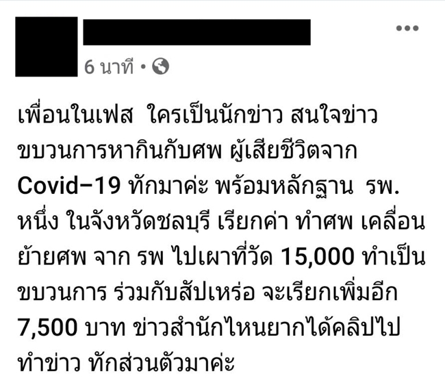 หลังจากมีผู้ใช้เฟซบุ๊กรายหนึ่งได้โพสต์ข้อความ โดยระบุว่า “เพื่อนในเฟซบุ๊กใคร ใครเป็นนักข่าว สนใจขบวนการหากินกับศพผู้เสียชีวิตจากโควิด-19 ทักมาค่ะ พร้อมหลักฐาน รพ.หนึ่งในจังหวัดชลบุรี เรียกค่าทำศพ เคลื่อนย้ายศพจาก รพ.ไปเผาที่วัด 15,000 บาท ทำเป็นขบวนการร่วมกับสัปเหร่อ จะเรียกเพิ่มอีก 7,500 บาท ข่าวสำนักไหนอยากได้คลิปไปทำข่าว ทักส่วนตัวมาค่ะ"