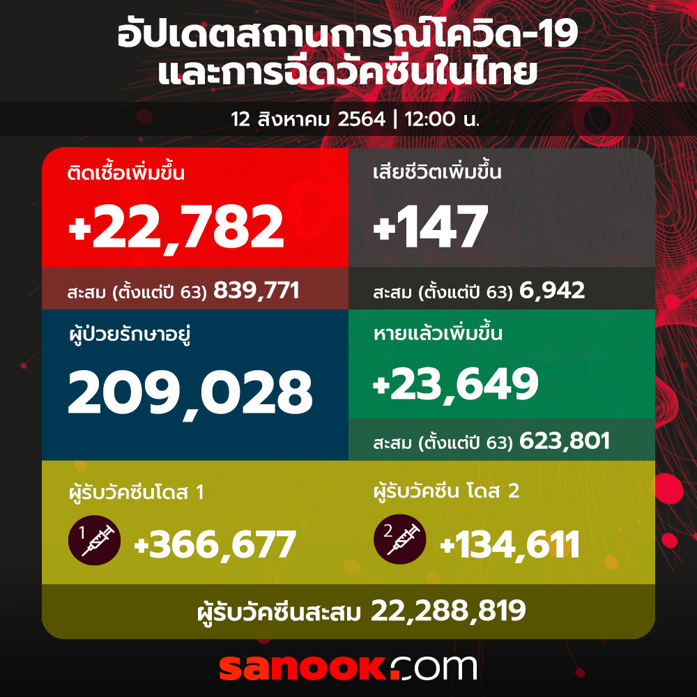 โควิดวันนี้ ไทยติดเชื้อเพิ่ม 22,782 ราย เสียชีวิตอีก 147 ราย กลับบ้านได้ 23,649 ราย
