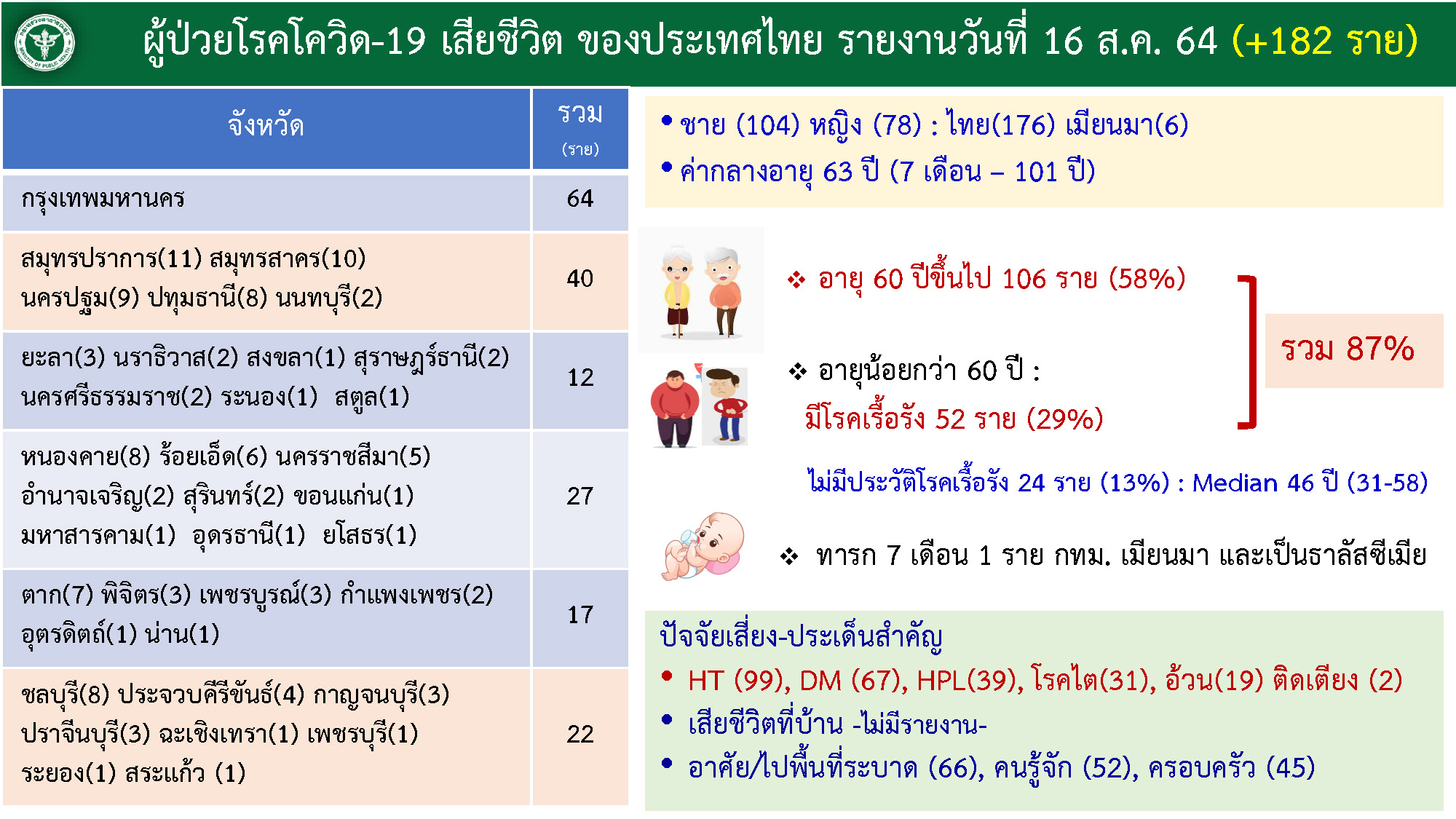 วันนี้ (16 ส.ค.) เมื่อเวลา 07.30 น. ศูนย์ปฏิบัติการภาวะฉุกเฉิน กรมควบคุมโรค กระทรวงสาธารณสุข เผยตัวเลขสถานการณ์การแพร่ระบาดของโควิด-19 ในประเทศไทย ว่า