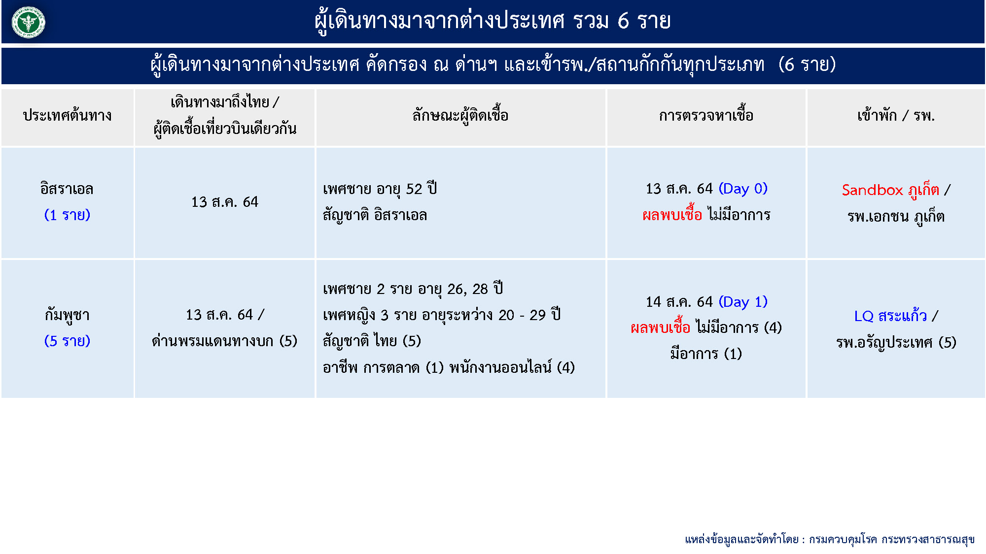 หมายเหตุ : อัปเดตข้อมูล เวลา 12.30 น. จากการแถลงของศูนย์บริหารสถานการณ์การแพร่ระบาดของโรคติดเชื้อไวรัสโคโรนา 2019 (ศบค.)