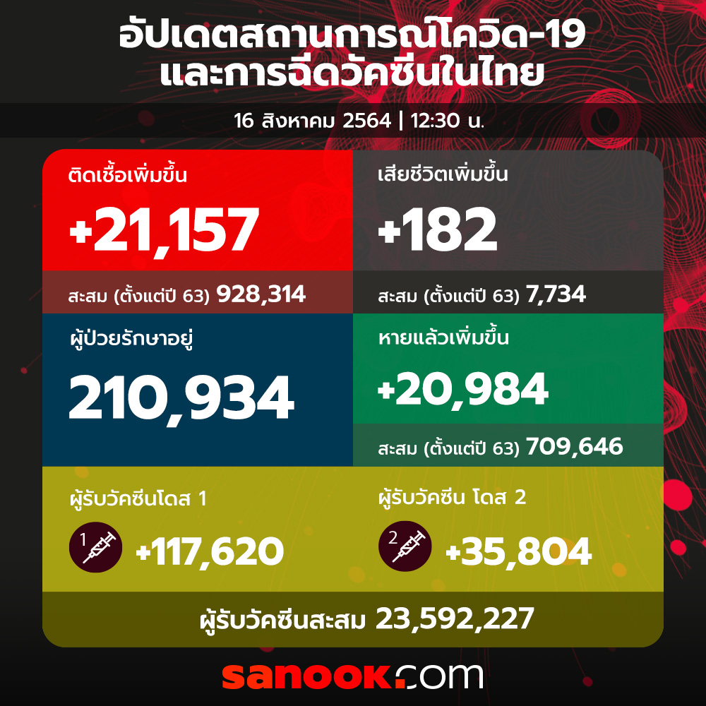 ล่าสุด สถานการณ์การแพร่ระบาดของโรคติดเชื้อไวรัสโคโรนา 2019 (COVID-19) หรือ โควิด-19 ในไทยวันนี้ พบผู้ติดเชื้อรายใหม่เพิ่ม 21,157 ราย แบ่งเป็นผู้ติดเชื้อใหม่ 20,499 ราย และผู้ติดเชื้อในเรือนจำ 658 ราย ยอดติดเชื้อรวมระลอกเมษายน 899,451 ราย รวมยอดติดเชื้อสะสม 928,314 ราย เสียชีวิตเพิ่ม 182 ราย เสียชีวิตสะสม 7,734 ราย หายป่วยเพิ่ม 20,984 ราย หายป่วยสะสมระลอกเมษายน 682,220 ราย ผู้ป่วยกำลังรักษา 210,934 ราย