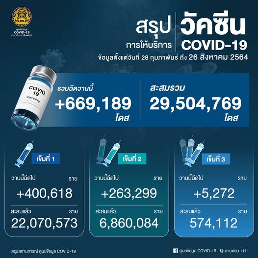 ภาพรวมยอดฉีดวัคซีน วันที่ 26 สิงหาคม 2564 ยอดฉีดทั่วประเทศ 669,189 โดส