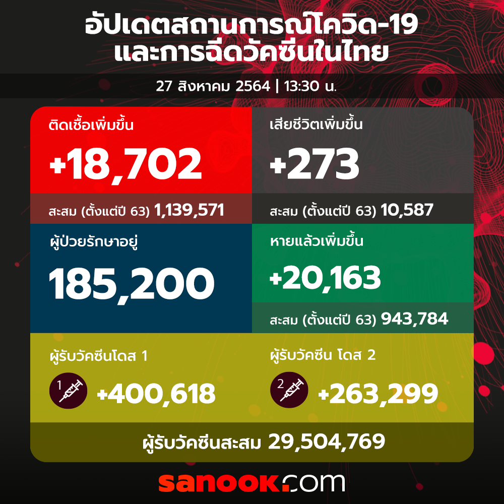 โควิดวันนี้ ติดเชื้อเพิ่ม 18,702 ราย เสียชีวิตอีก 273 ราย หายป่วยเพิ่ม 20,163 ราย