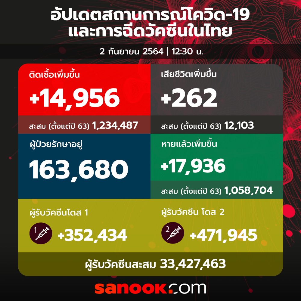 เริ่มจะนิ่ง..โควิดวันนี้ ติดเชื้อเพิ่ม 14,956 ราย เสียชีวิต 262 ราย หายป่วย 17,936 ราย