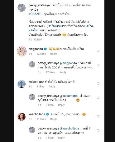 โดยเธอได้โพสต์ภาพและเขียนแคปชั่นบอกเล่าไว้ว่า "ปลอบโยนเพื่อนบ้านที่น่ารัก ด้วยกระเป๋า #CHANEL คุณพี่หนุ่ย คุณพี่ต้อย เนื่องจากบ้านเป็กกำลังสร้างอาจมีเสียงดังไปบ้าง ขออภัยนะคะ (#บ้านหลังแรก ข้างบ้านติดกัน #บ้านหลังใหม่ หลังบ้านติดกัน) บ้านเป็กล้อมไว้หมดเลยค่ะ ห้ามหนีนะคะ รัก"