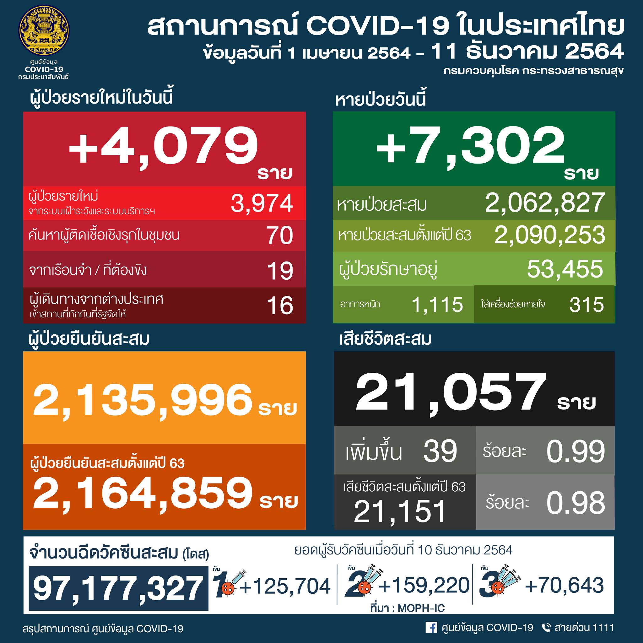 ยอดผู้ติดเชื้อโควิด-19 วันเสาร์ที่ 11 ธันวาคม 2564 รวม 4,079 ราย จำแนกเป็น