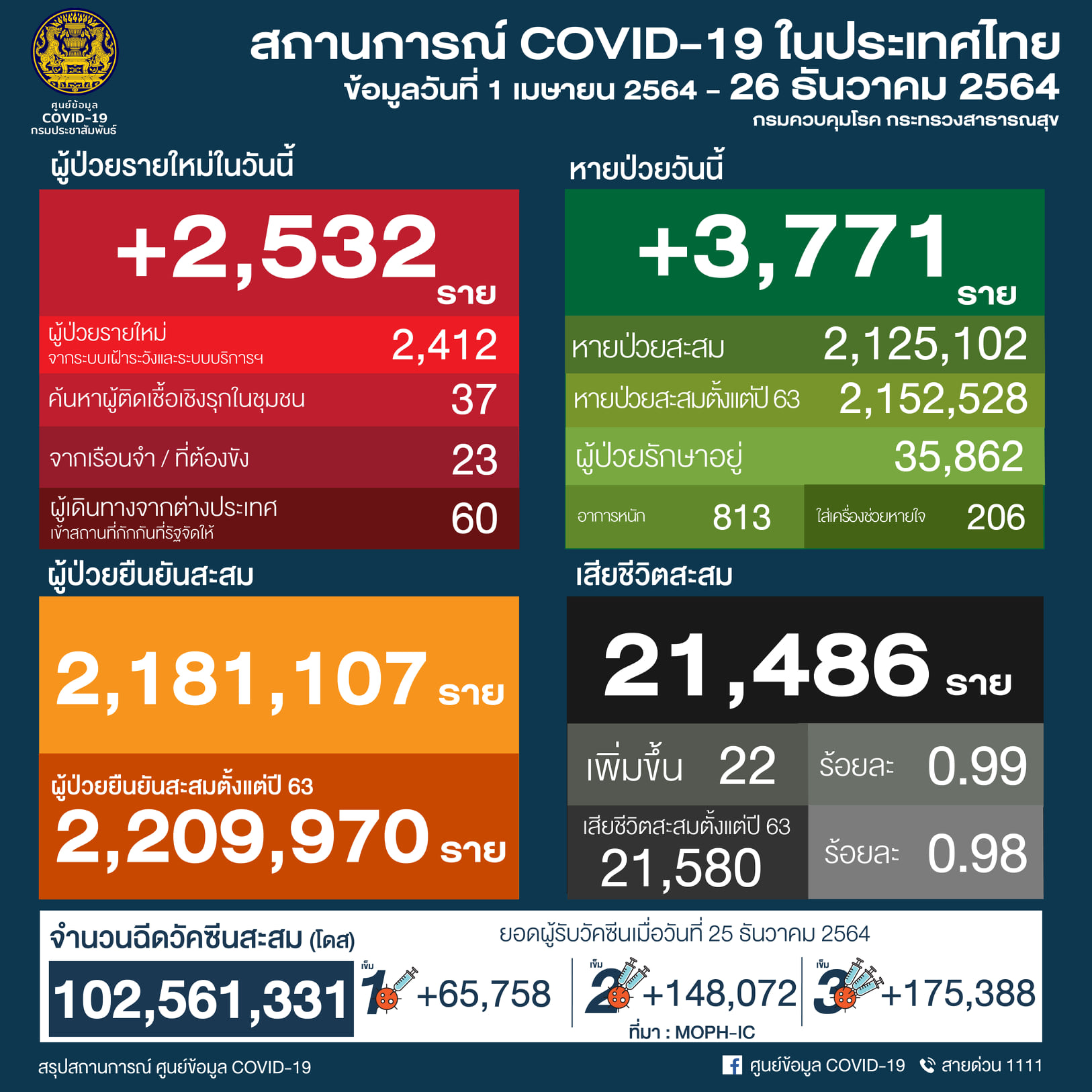 จำนวนการได้รับวัคซีนสะสม (28 ก.พ. - 25 ธ.ค. 2564) รวม 102,561,331 โดส ใน 77 จังหวัด