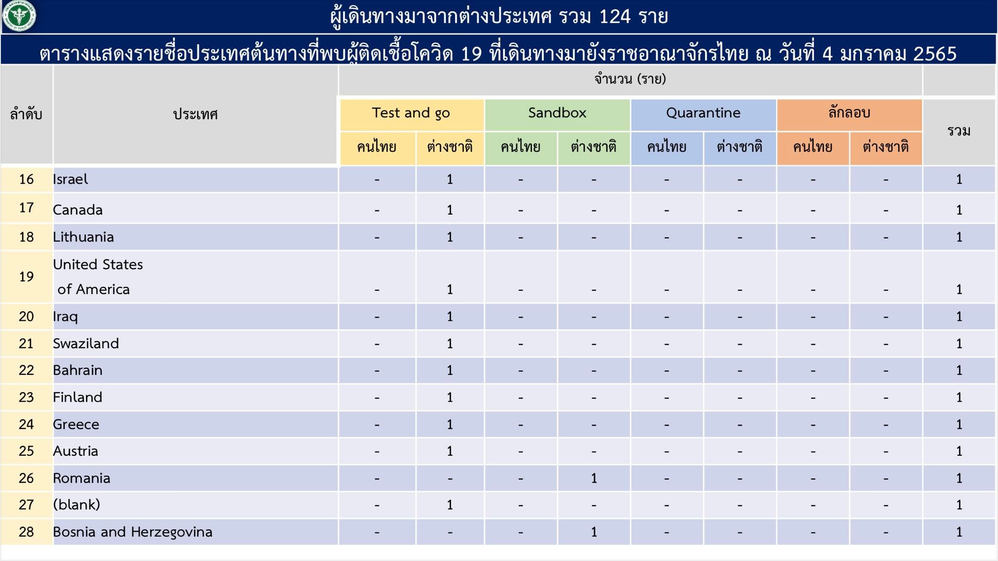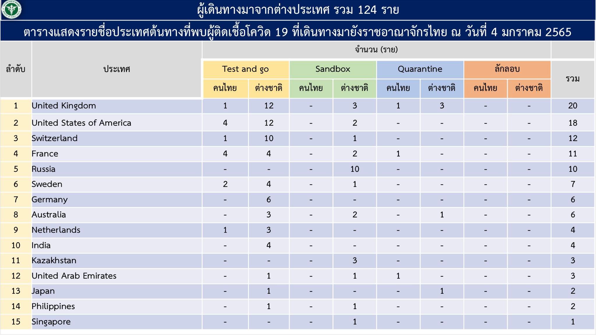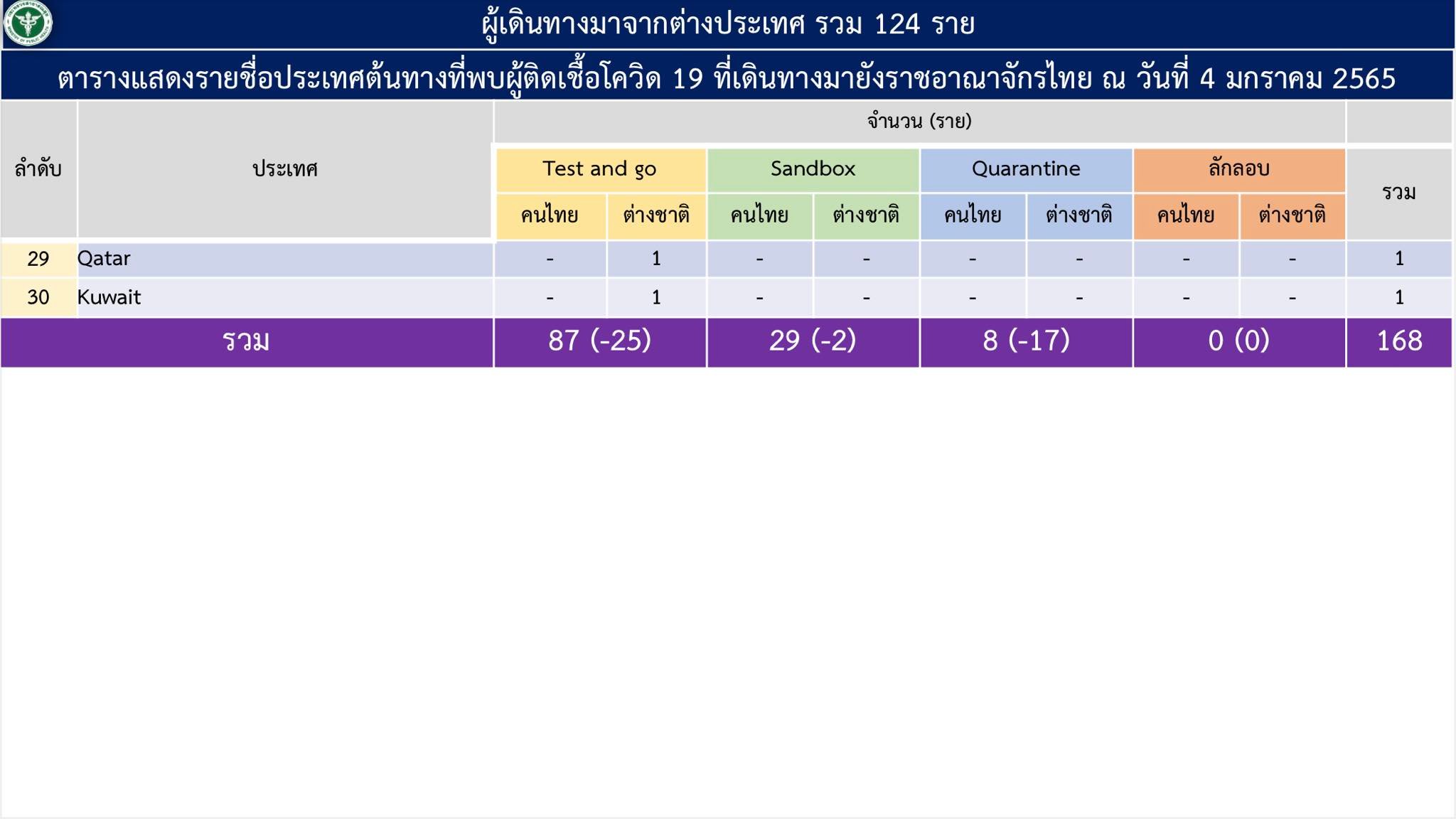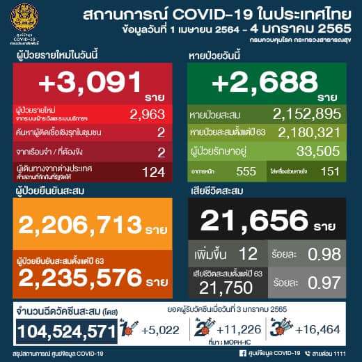ยอดผู้ติดเชื้อโควิด-19 วันอังคารที่ 4 มกราคม 2565 รวม 3,091 ราย จำแนกเป็น