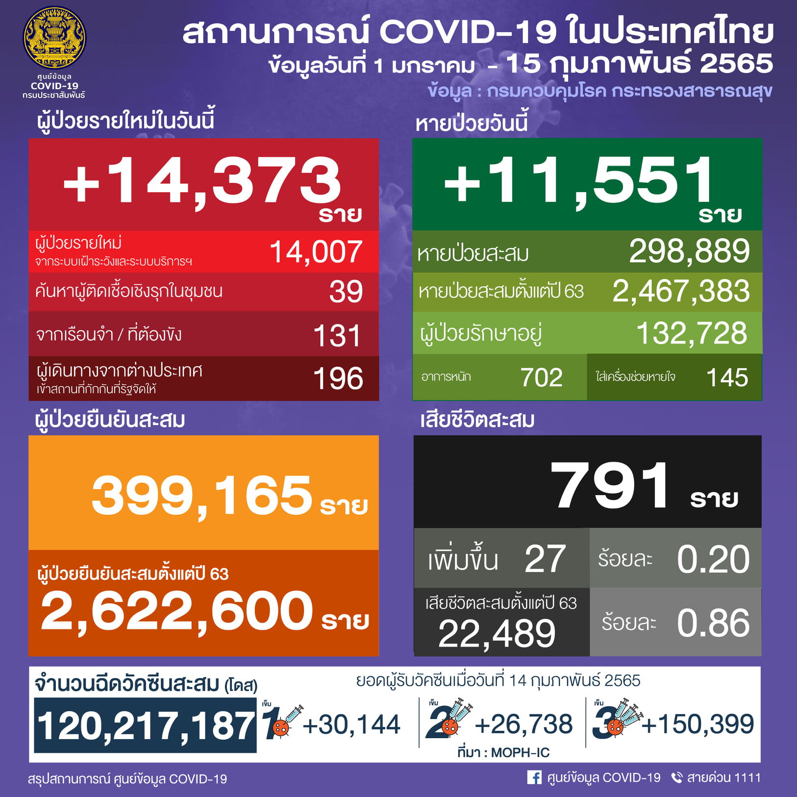 ยอดผู้ติดเชื้อโควิด-19 วันอังคารที่ 15 กุมภาพันธ์ 2565 รวม 14,373 ราย จำแนกเป็น
