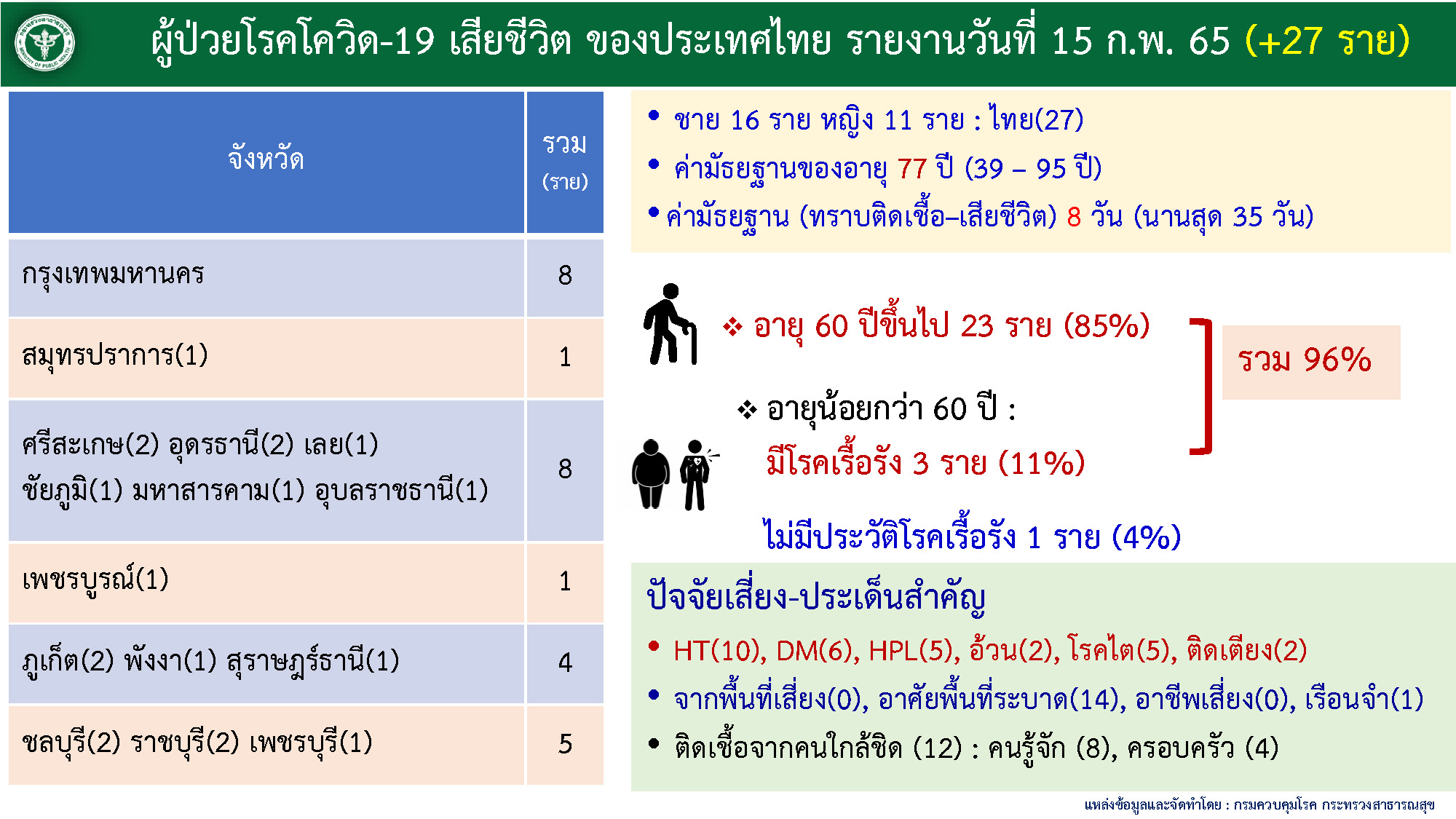 รายละเอียดผู้เสียชีวิตของประเทศไทยวันอังคารที่ 15 กุมภาพันธ์ 2565 จำนวน 27 ราย