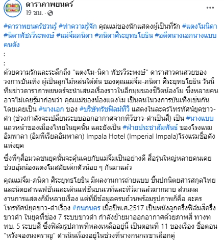 "ทีมข่าวดาราภาพยนตร์จะนำเสนอเรื่องราวในอีกมุมของชีวิตน้องโม ซึ่งหลายคนอาจไม่เคยรู้มาก่อนว่า คุณแม่ของน้องแตงโม เป็นคนในวงการบันเทิงเช่นกัน โดยเคยเป็น #นางเอก ของ #บริษัทรัชฟิลม์ทีวี แสดงในละครโทรทัศน์ยุคขาว-ดำ (ช่วงกำลังจะเปลี่ยนระบบออกอากาศจากทีวีขาว-ดำเป็นสี) เป็น #นางแบบ แถวหน้าของเมืองไทยในยุคนั้น และยังเป็น #ฝ่ายประชาสัมพันธ์ ของโรงแรมอิมพาลา (อิมพีเรียลอิมพาลา) Impala Hotel (Imperial Impala) โรงแรมชื่อดังแห่งยุค"