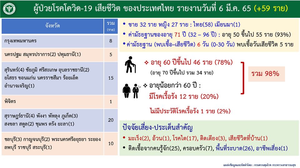 รายละเอียดผู้เสียชีวิตของประเทศไทย วันอาทิตย์ที่ 6 มีนาคม 2565 จำนวน 59 ราย