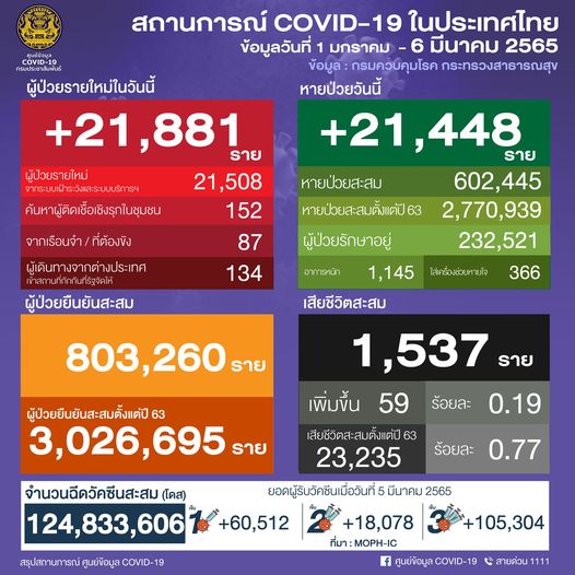ยอดผู้ติดเชื้อโควิด-19 วันอาทิตย์ที่ 6 มีนาคม 2565 รวม 21,881 ราย จำแนกเป็น
