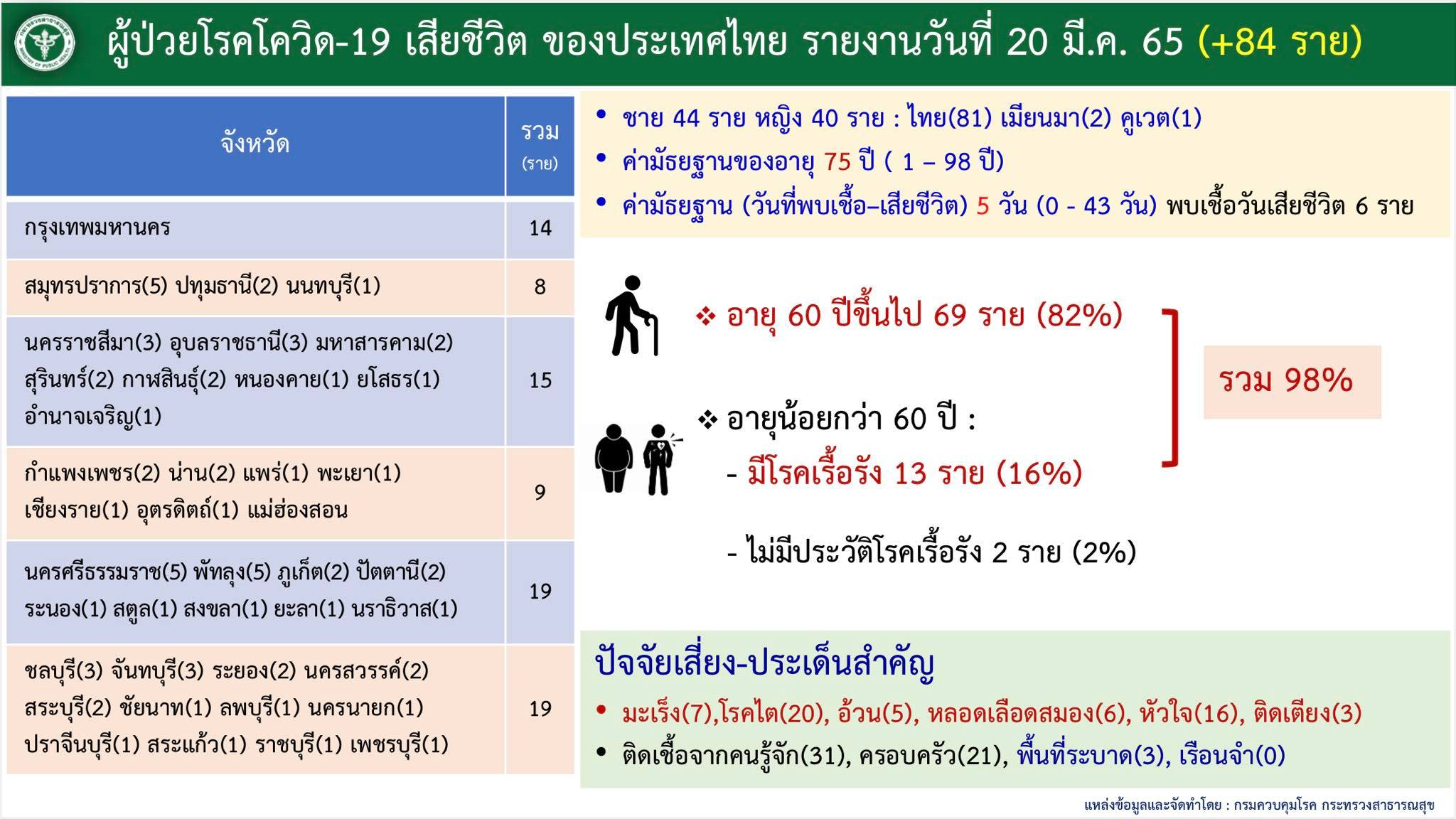 รายละเอียดผู้เสียชีวิตของประเทศไทย วันอาทิตย์ที่ 20 มีนาคม 2565 จำนวน 84 ราย