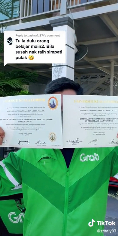 ซึ่งไรเดอร์หนุ่มตอบกลับว่า ตนเองเรียนมาดี แต่โชคไม่ดีที่ไม่ได้มีงานประจำ และบอกให้เจ้าของคอมเมนต์อธิษฐานเผื่อตนเอง จากนั้นเขาก็แสดงใบปริญญาบัตร 2 ใบ ใบหนึ่งเป็นปริญญาตรีด้านวิศวกรรมซ่อมบำรุงอากาศยาน และอีกใบเป็นปริญญาตรีด้านวิศวกรรมเครื่องกลอากาศยาน