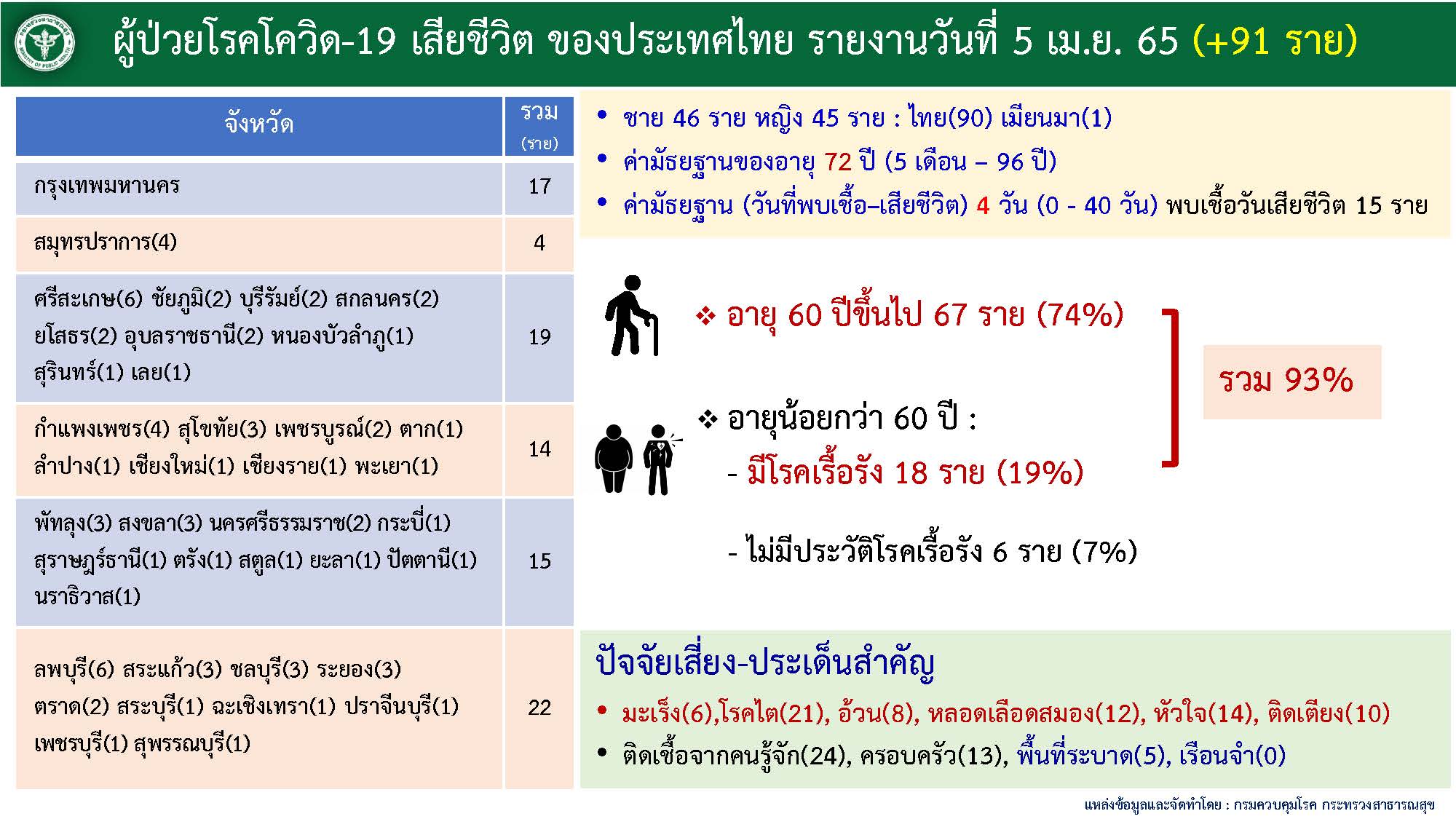 รายละเอียดผู้เสียชีวิตของประเทศไทยวันอังคารที่ 5 เมษายน 2565 จำนวน 91 ราย