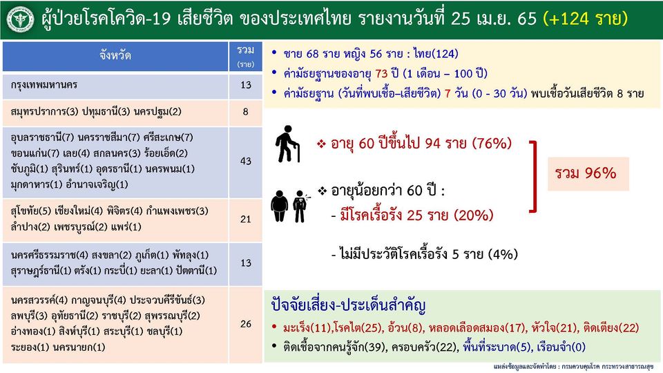 รายละเอียดผู้เสียชีวิตของประเทศไทย วันจันทร์ที่ 25 เมษายน 2565 จำนวน 124 ราย
