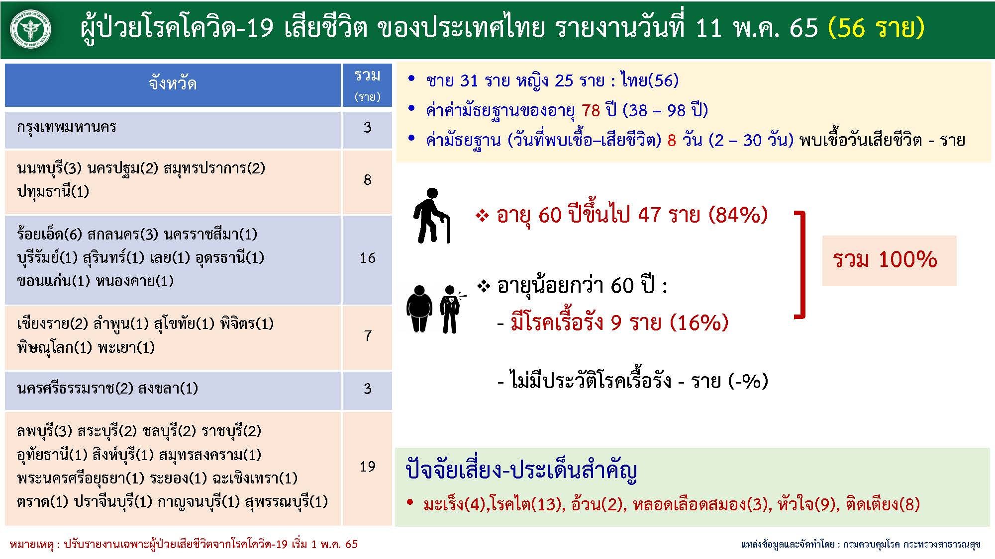 รายละเอียดผู้เสียชีวิตของประเทศไทยวันพุธที่ 11 พฤษภาคม 2565 จำนวน 56 ราย