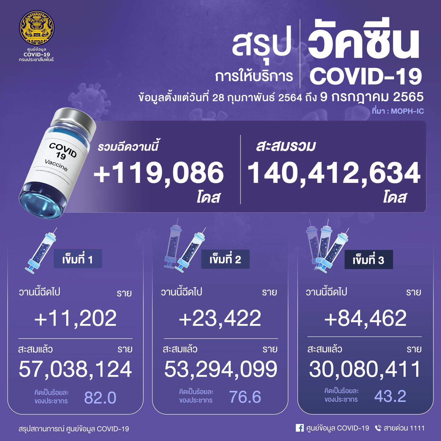 จำนวนการได้รับวัคซีนสะสม (28 ก.พ. 2564 - 9 ก.ค. 2565) รวม 140,412,634 โดส ใน 77 จังหวัด