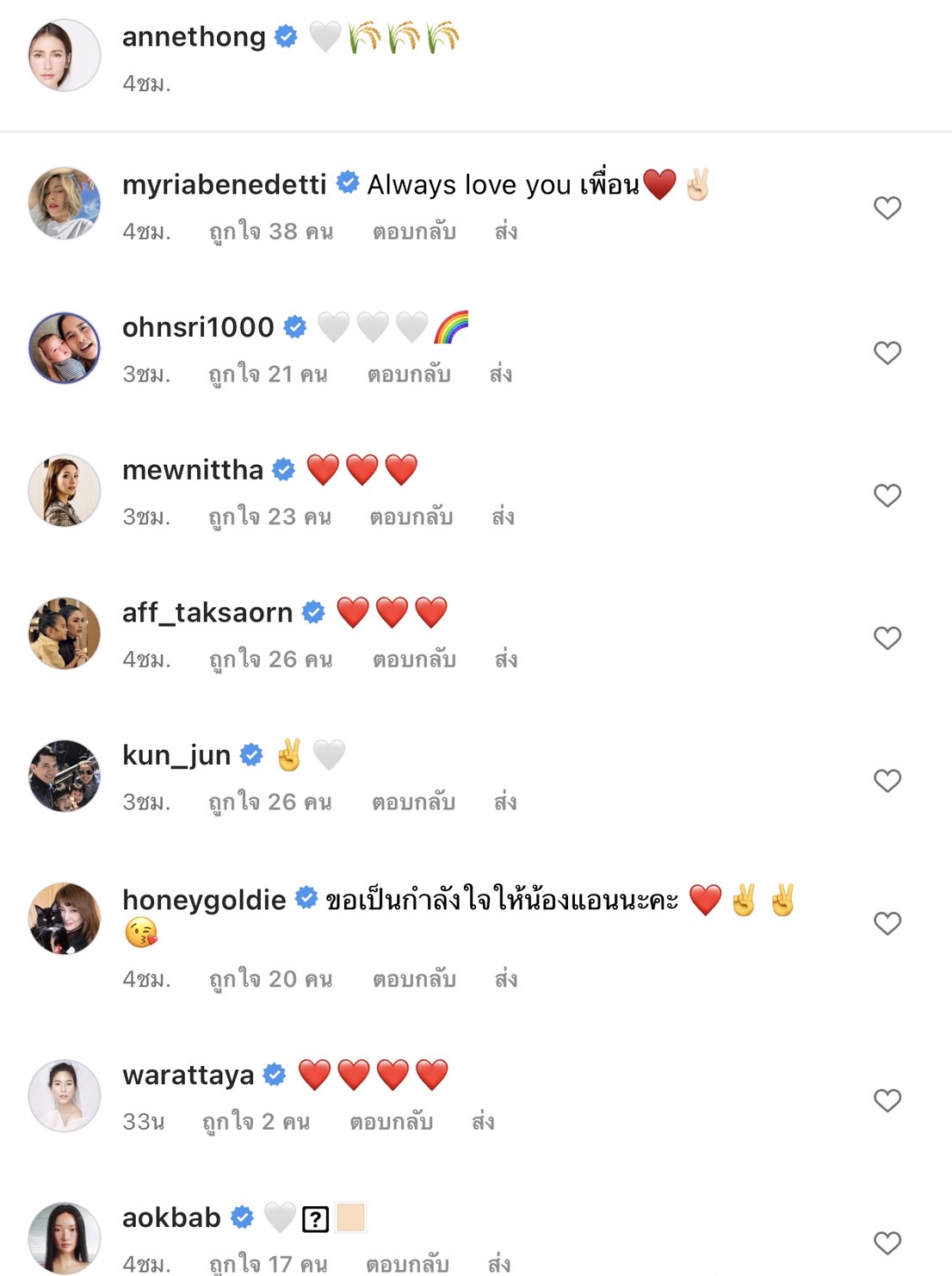 แม้ไม่มีข้อความใดๆ แต่ทั้งเหล่าคนบันเทิงและแฟนๆแห่เข้ามากดไลก์และคอมเมนต์ให้กำลังใจ ทั้ง ญาญ่า อัสยา, นิว นภัสสร, อ้น ศรีพรรณ, นัท มีเรีย, มิว นิษฐา, แอฟ ทักษอร, หน่อย บุษกร, จ๊ะ นงผณี, เปิ้ล หัทยา, ฝน ศนันธฉัตร ร่วมกับแฟนๆ อีกมากมาย เรียกว่าหัวใจและความห่วงใยเต็มพื้นที่เลยทีเดียว