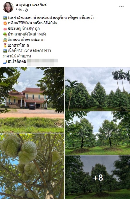 โดยระบุว่า "ใครกำลังมองหาบ้านพร้อมสวนทุเรียน เชิญทางนี้เลยจ้า ทุเรียน 7 ปี 80 ต้น ทุเรียน 3 ปี 40 ต้น สระใหญ่ น้ำใสๆ 1 ลูก บ้านสวยหลังใหญ่ 1 หลัง ติดถนน เดินทางสะดวก เอกสารโฉนด เนื้อที่ 4 ไร่ 2 งาน 6"