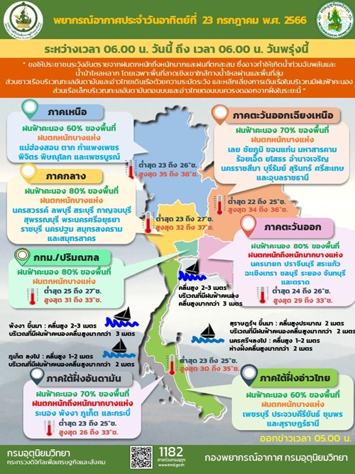วันนี้ (23 ก.ค.) กรมอุตุนิยมวิทยา พยากรณ์อากาศ 24 ชั่วโมงข้างหน้า ประเทศไทยยังคงมีฝนตกต่อเนื่อง และมีฝนตกหนักบางแห่งในภาคเหนือตอนล่าง ภาคตะวันออกเฉียงเหนือ ภาคกลาง รวมทั้งกรุงเทพมหานครและปริมณฑล และภาคใต้ฝั่งตะวันออก โดยมีฝนตกหนักมากบางพื้นที่ในภาคตะวันออก และภาคใต้ฝั่งตะวันตก