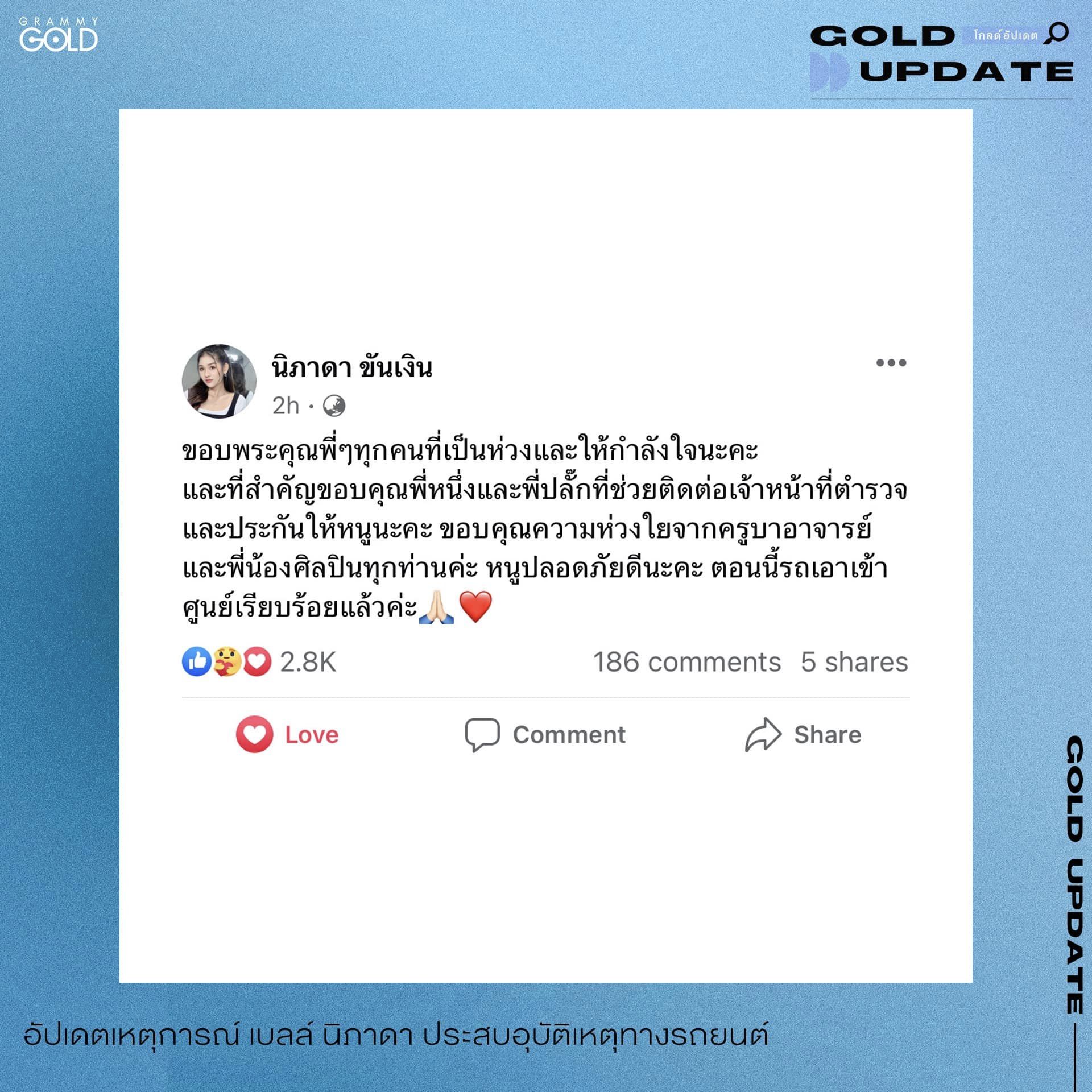 ล่าสุด ทางต้นสังกัด แกรมมี่โกลด์ ได้อัปเดตเหตุการณ์พร้อมกับบอกว่านักร้องสาวปลอดภัย