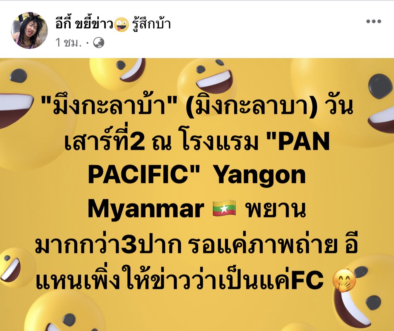 ก่อน อีกี้ ขยี้ข่าว จะบอกใบ้รายละเอียดอีกโพสต์ว่า “ "มึงกะลาบ้า" (มิงกะลาบา) วันเสาร์ที่2 ณ โรงแรม "PAN PACIFIC" Yangon Myanmar MM พยานมากกว่า3ปาก รอแค่ภาพถ่าย อีแหนเพิ่งให้ข่าวว่าเป็นแค่FC”
