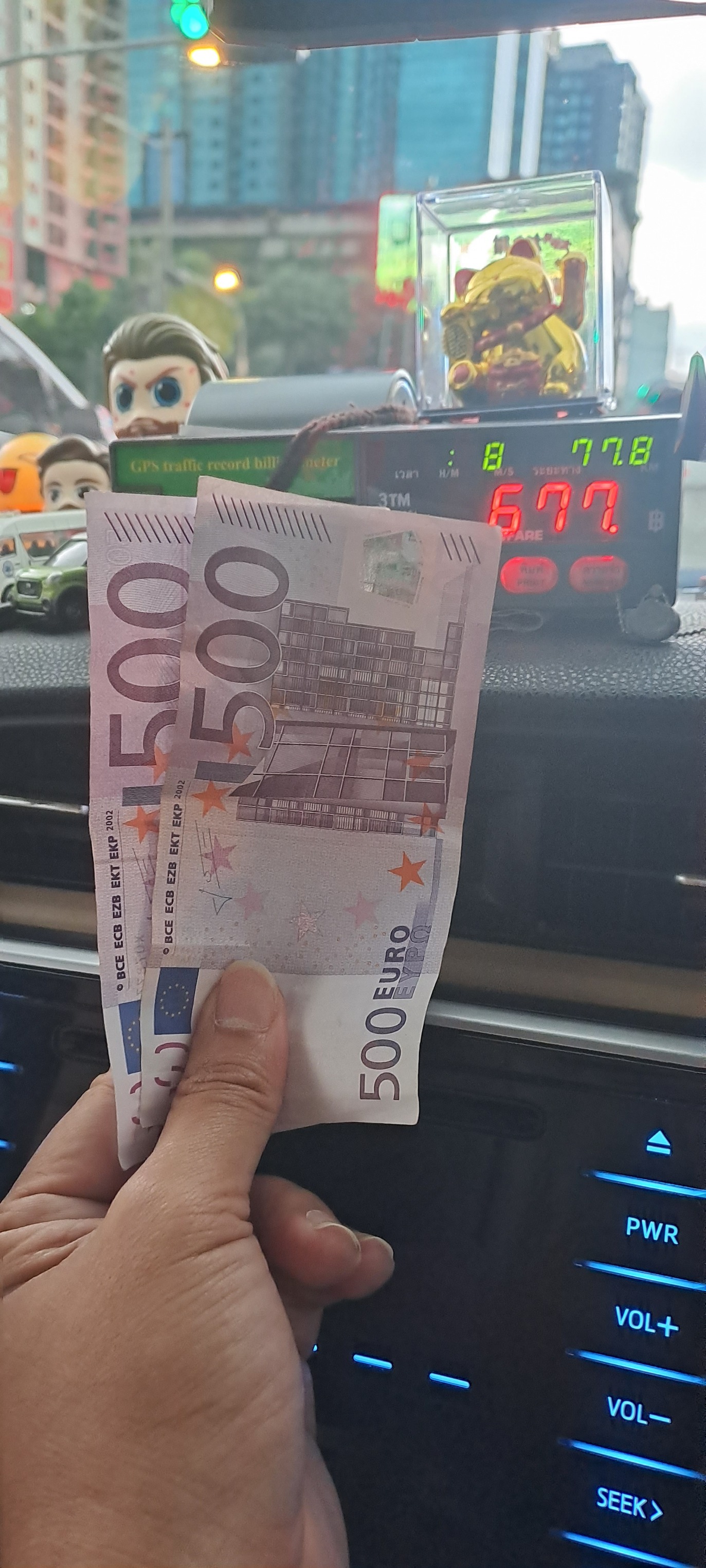 โชเฟอร์แท็กซี่รายหนึ่งโพสต์ภาพลงในกลุ่มเฟซบุ๊ก รวมพลคนขับแท็กซี่(แห่งประเทศไทย) โดยเป็นภาพมิเตอร์ 677 บาท และธนบัตร 500 ยูโร จำนวน 2 ใบ พร้อมระบุข้อความว่า “ลูกค้าบอกว่า I gave you change” ซึ่งก็หมายความว่าไม่รับเงินทอน