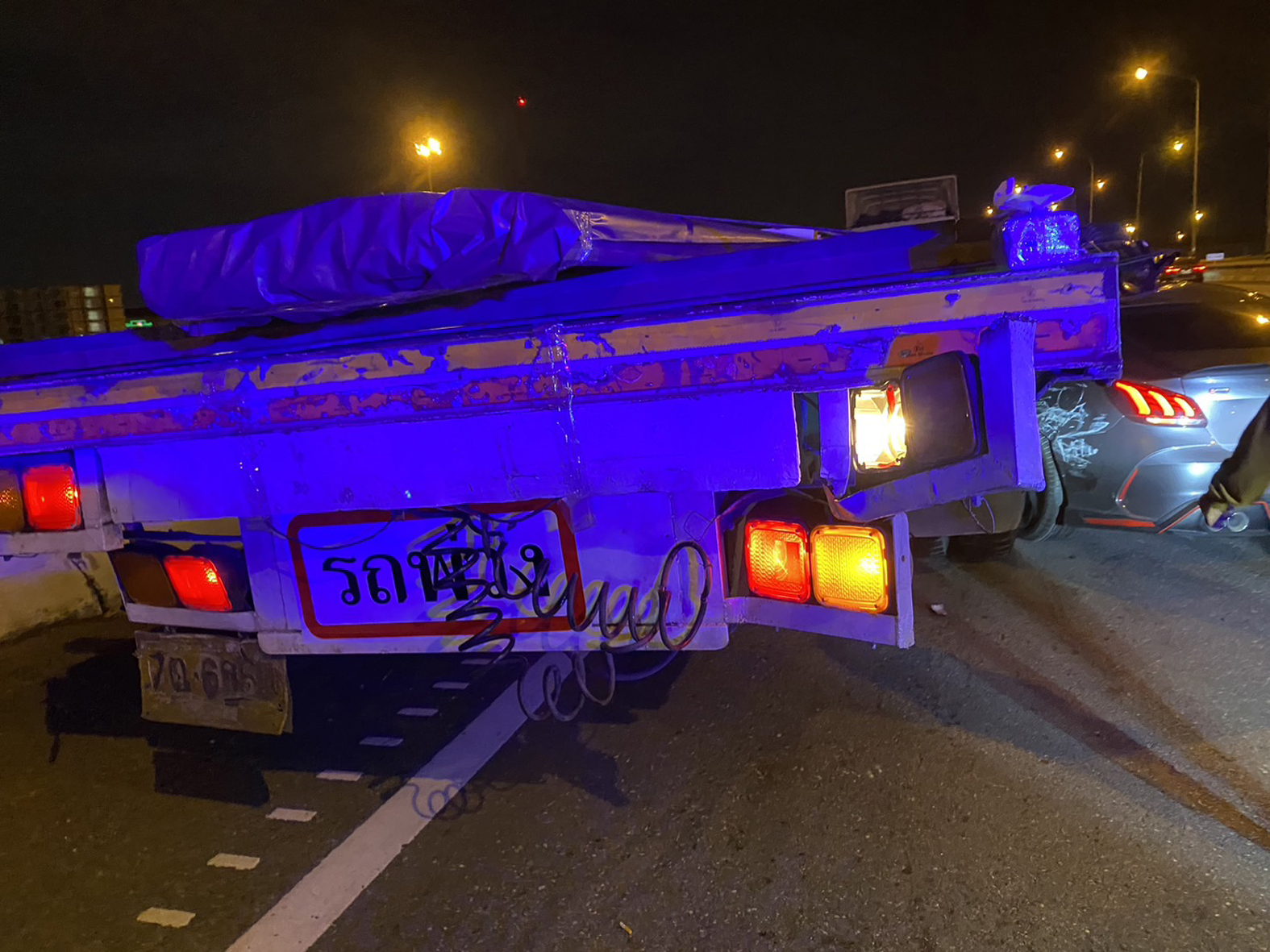 ในที่เกิดเหตุพบผู้ได้รับบาดเจ็บจำนวน 3 ราย เป็นชาย 1 ราย และหญิง 2 ราย ได้รับบาดเจ็บเล็กน้อย เจ้าหน้าที่มูลนิธิให้การช่วยเหลือปฐมพยาบาลเบื้องต้นก่อนนำส่งโรงพยาบาลใกล้เคียง ในที่พบรถบรรทุกพ่วง เทรลเลอร์ จอดอยู่เลนซ้าย ล้อหลังของพ่วงหลุด ที่ฝั่งขวาของหางพ่วงพบรถยนต์เก๋ง ยี่ห้อเอ็มจี สีดำ หน้ามุดอยู่ใต้หางพ่วง สภาพหลังคาและกระจกหน้าพังยับ มีล้อของรถพ่วงอยู่บนหลังคาตรงฝั่งคนขับ