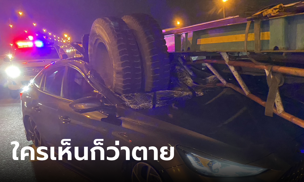 สภาพสุดช็อก ล้อรถบรรทุกหลุดใส่หน้ารถเก๋ง คนขับบอกภาพตัด รู้ตัวอีกทีเสียหลักไปเสียบอยู่ท้ายรถพ่วง
