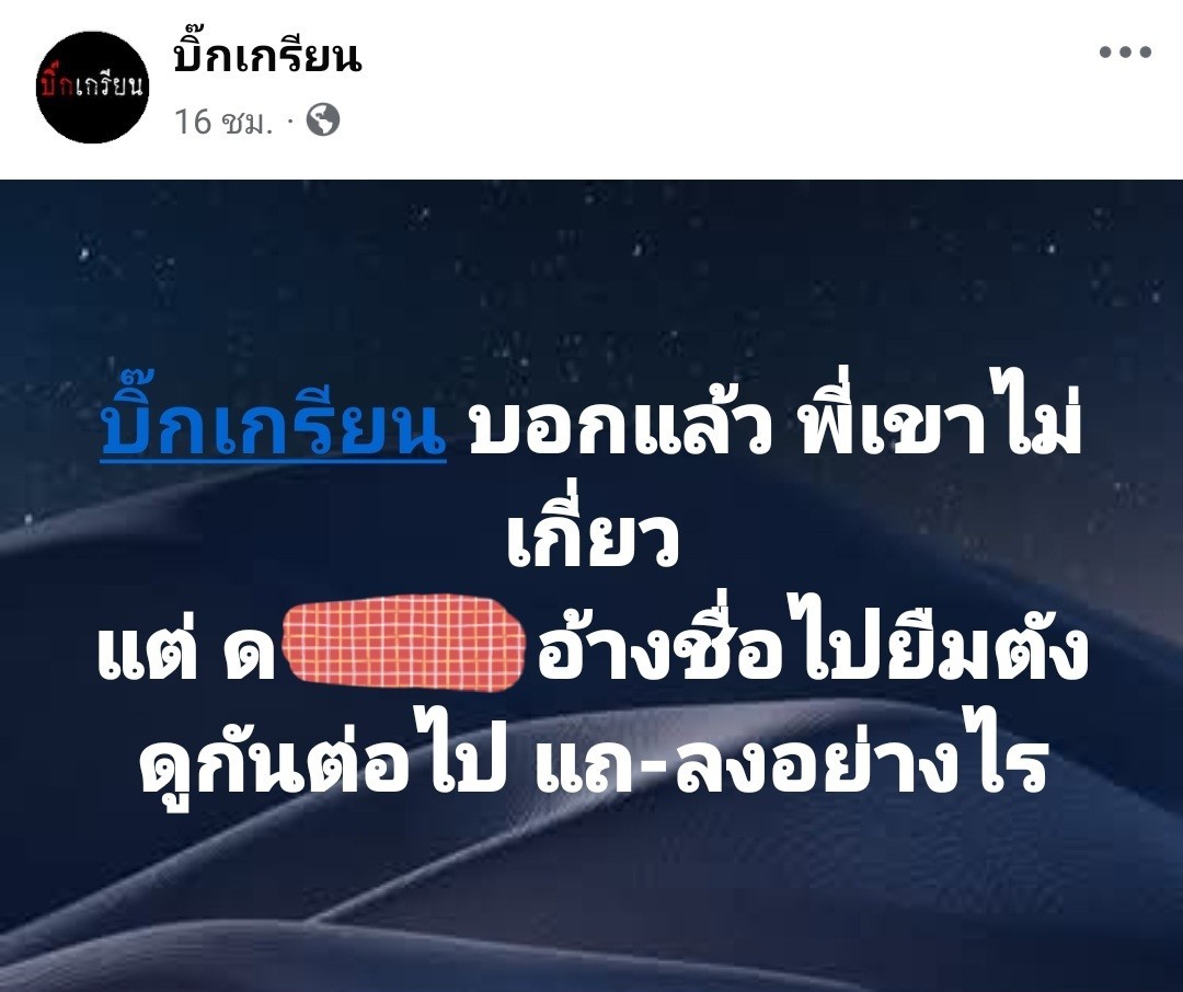 โดยในเพจ บิ๊กเกรียน ได้เขียนข้อความไว้ว่า "#เพราะเชื่อใจ ปฐมบทของเรื่อง ด xx xx ทักยืม อ้างปล่อยกู้ จากวันนั้นถึงวันนี้ กลายเป็นลม แถมเอาชื่อคนดัง มาข่มขู่เจ้าหนี้ ."