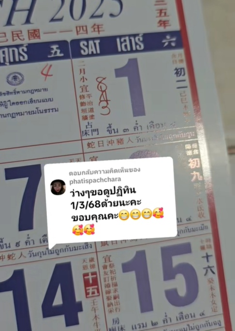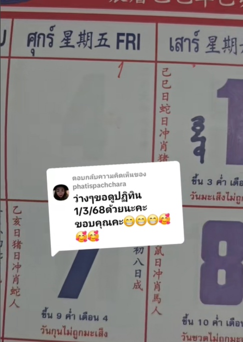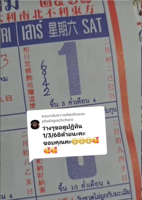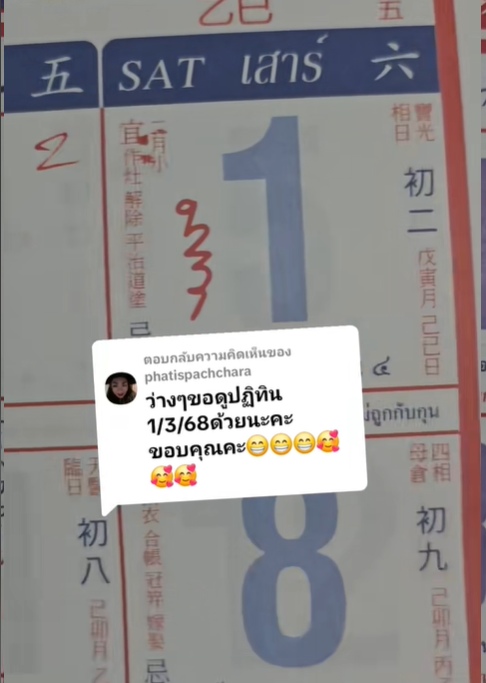 สำหรับเลขปฏิทินจีน หวยงวด 1/3/68 ผู้ใช้แอปพลิเคชั่น TikTok บัญชี nid8857 ปทุมราชเทคนิคโซล่าเซลท์ ได้โพสต์คลิปปฏิทินจีนแบ่งปันแนวทางให้แก่นักเสี่ยงโชค จำนวน 4 ฉบับ โดยแต่ละตัวเลขก็จะแตกต่างกันออกไป อยู่ที่ว่าใครจะมองเป็นเลขใดบ้าง ซึ่งใครจะเห็นเป็นเลขใด กดดูรูปได้เลยจ้า