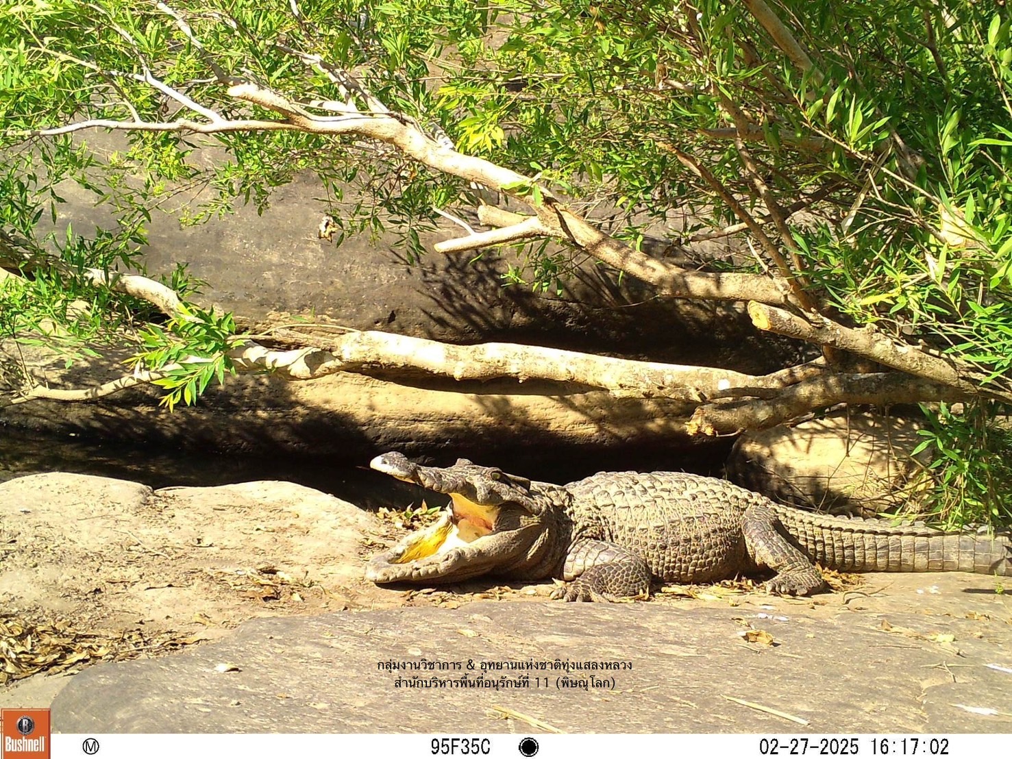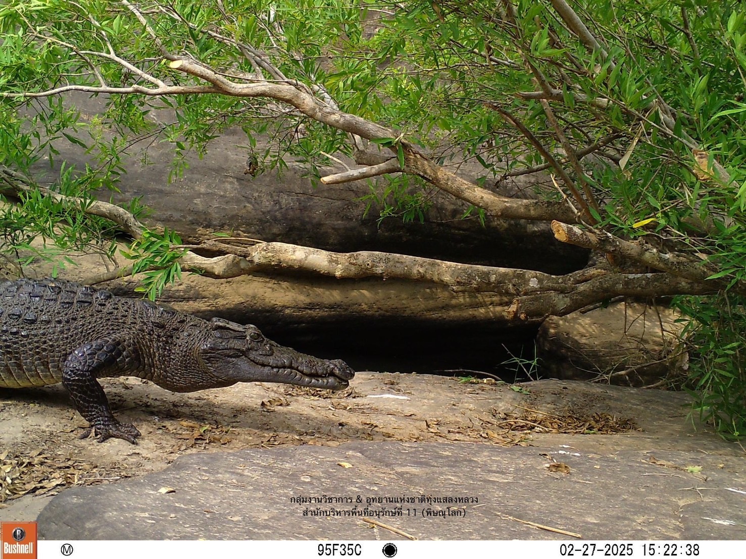 ภาพจากกล้องดักถ่ายสัตว์ป่าแสดงให้เห็นจระเข้ขนาดใหญ่กำลังนอนอาบแดดบนโขดหินริมน้ำ ท่ามกลางสภาพแวดล้อมที่สมบูรณ์ การค้นพบนี้เป็นผลจากการติดตามประชากรจระเข้ในพื้นที่ตั้งแต่เดือนตุลาคม 2567 โดยมีการสำรวจร่องรอยและติดตั้งกล้องดักถ่ายเป็นประจำ ทั้งนี้ พื้นที่ดังกล่าวเคยมีรายงานพบจระเข้ครั้งล่าสุดในปี 2556 และชาวบ้านให้ข้อมูลว่ายังพบเห็นอยู่เรื่อยมา