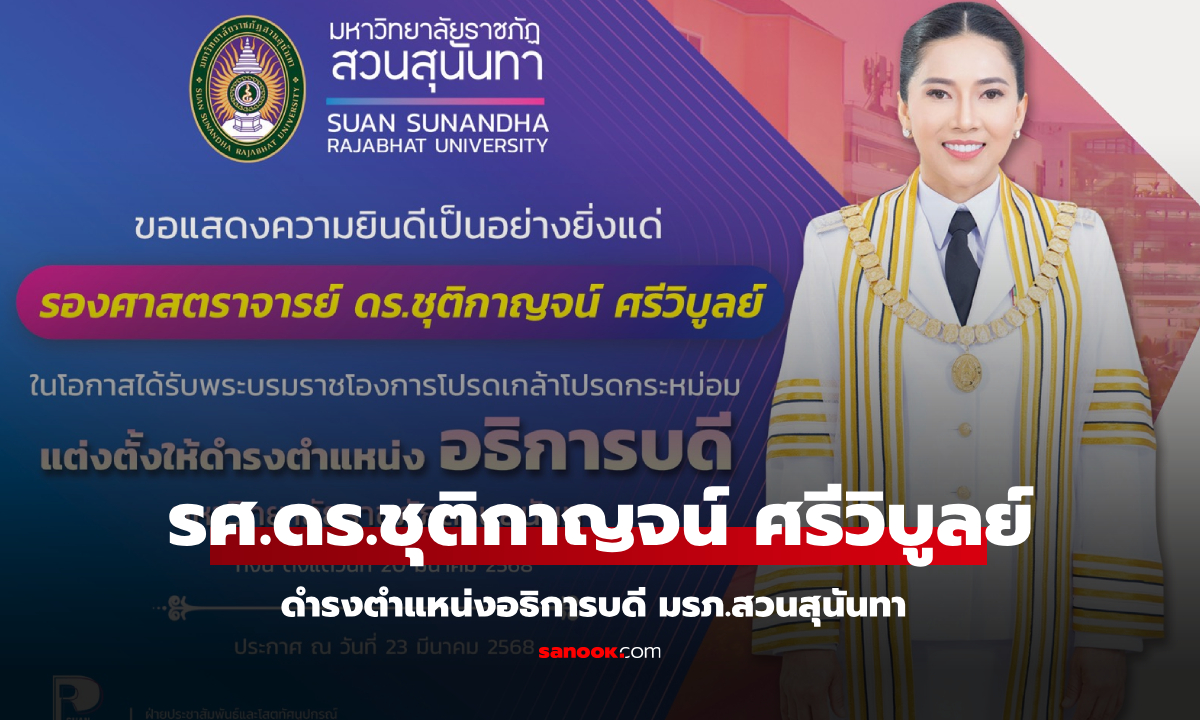 ภายหลังสำนักเลขาธิการคณะรัฐมนตรีได้นำความกราบบังคมทูลพระกรุณาโปรดเกล้าโปรดกระหม่อมแต่งตั้งอย่างเป็นทางการ บัดนี้ได้มีพระบรมราชโองการโปรดเกล้าโปรดกระหม่อมแต่งตั้ง รองศาสตราจารย์ ดร.ชุติกาญจน์ ศรีวิบูลย์ ให้ดำรงตำแหน่งอธิการบดีมหาวิทยาลัยราชภัฏสวนสุนันทา ตั้งแต่วันที่ 20 มีนาคม 2568 เป็นต้นไป